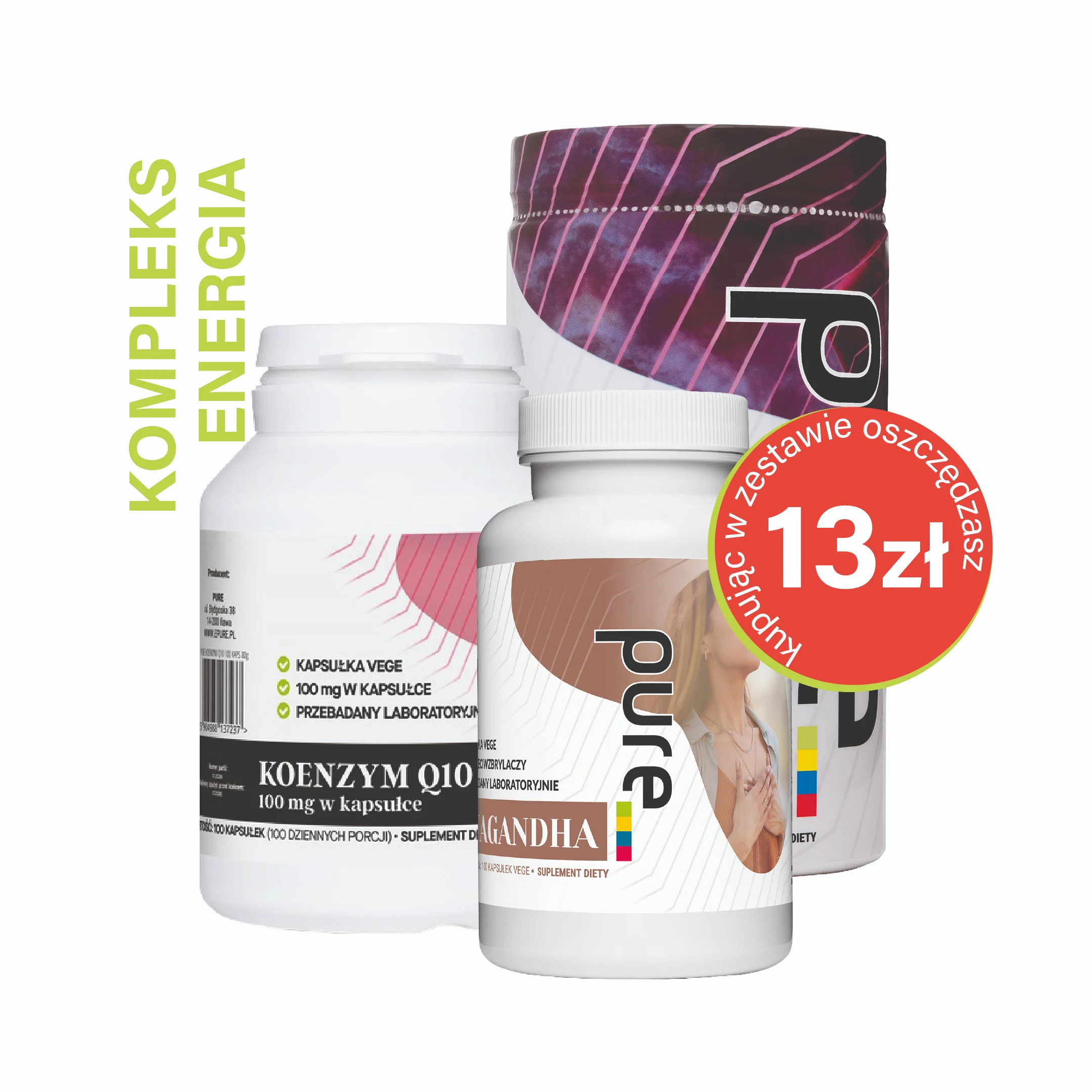 Kompleks Energia to praktyczny zestaw suplementów PURE dla osób prowadzących aktywny tryb życia. Zawiera kreatynę monohydrat 500 g, koenzym Q10 100 mg (100 kapsułek VEGE) oraz ashwagandhę (100 kapsułek VEGE).